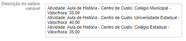 Quando o contrato do colaborador possuir atividades associadas e o campo Cargo, da seção Cargo e Função seja do tipo Horista e não estiver associado a uma tabela salarial, a descrição do Salário variável será preenchida automaticamente com a descrição da atividade seguida da descrição do centro de custo e o valor da hora