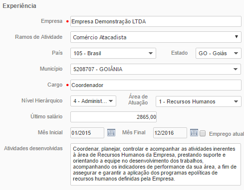 atividades do colaborador na empresa anterior. Caso o colaborador ainda esteja trabalhando