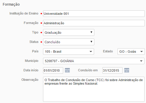 Para cadastrar uma formação para o colaborador, clique sobre o botão e insira as seguintes informações: