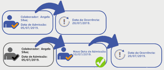 Neste cenário, o operador não conseguiu realizar a inserção da nova Data de admissão do colaborador, pois esta se encontrava posterior à data da ocorrência.