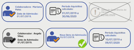 O período aquisitivo é calculado com base na Data de admissão e ao registrar uma Ocorrência de Férias, o período aquisitivo é considerado conforme o seguinte cenário: