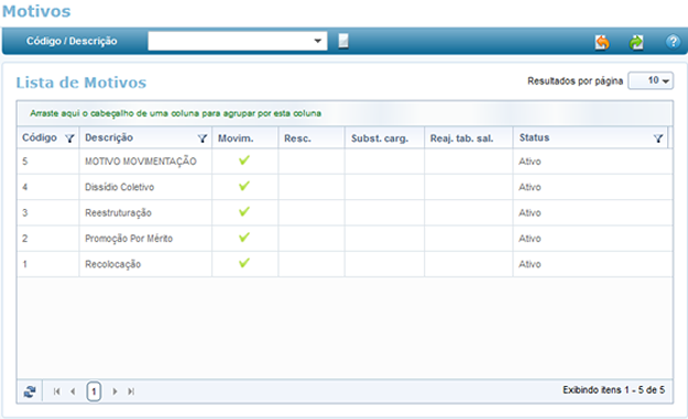 Ao acessar a funcionalidade de motivos é possível visualizar a lista de motivos já cadastrados, nessa tela podemos realizar algumas operações, como: ordenações, filtros e agrupamentos. Para saber mais clique aqui.