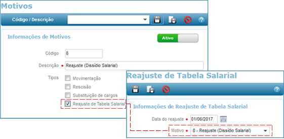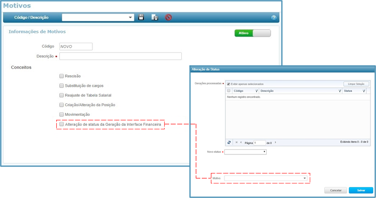 Através dessa funcionalidade é possível cadastrar motivos que indicam o porquê de alguma movimentação feita com o colaborador. Ao cadastrar um motivo devemos indicar em quais funcionalidades eles serão apresentados. As funcionalidades possíveis são: Rescisão, Substituição de Cargos, Reajuste de Tabela Salarial, Movimentação e Geração da Interface Financeira.