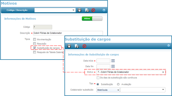 Caso seja cadastrado o motivo 07 - Cobrir Férias de Colaborador, e esteja selecionado o conceito Substituição de cargos. Este será apresentado na funcionalidade Substituição de cargos, conforme imagem abaixo: