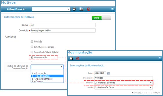 Para empresas que compõe administração pública, caso o conceito desejado para cadastro do motivo seja Movimentação, e a movimentação a ser realizada seja de Cargo ou Função, o preenchimento do campo Motivo da alteração do Cargo ou Função é obrigatório.