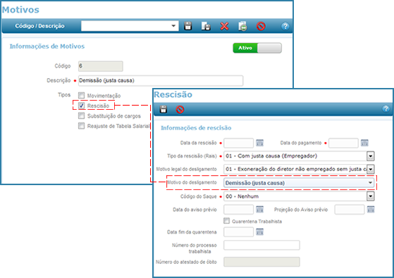 Caso seja cadastrado o motivo 06 - Demissão (justa causa), e esteja selecionado o conceito Rescisão. Este será apresentado na funcionalidade Rescisão, conforme imagem abaixo: