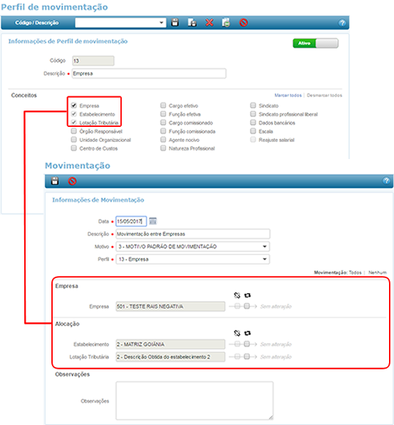 Os conceitos: Estabelecimento, Unidade Organizacional, Centro de Custos, Órgão Responsável, Natureza profissional, Sindicato, Sindicato Profissional Liberal, Agente Nocivo e Lotação Tributária compõem a seção Alocação na funcionalidade Movimentação, desta forma será possível escolher os itens que serão exibidos no perfil de acordo com as ocorrências praticadas pela empresa.