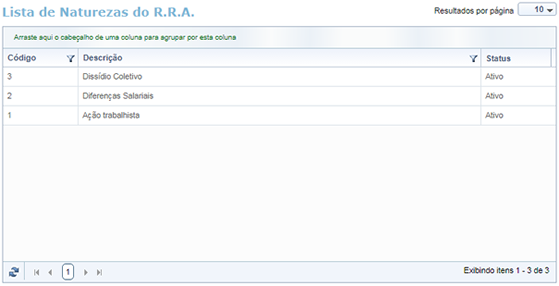 Na lista de naturezas do R.R.A são apresentadas todas as naturezas cadastradas, sendo possível realizar algumas operações como: ordenações, filtros, e agrupamentos. Para saber mais clique aqui.