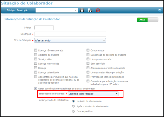 Existem diversas situações que podem gerar estabilidade para um colaborador, através dessa funcionalidade é possível cadastrar os tipos de estabilidade, que poderão ser utilizados nas funcionalidades Situação do Colaborador e Estabilidade.