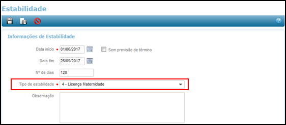 Ao cadastrar o seguinte Tipo de Estabilidade, 4 - Licença Maternidade, este poderá ser utilizado nas seguintes funcionalidades: