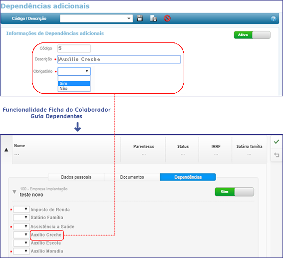 No campo Obrigatório, é imprescindível indicar se a dependência cadastrada será obrigatória ou não. Por padrão esse campo virá sem preenchimento.