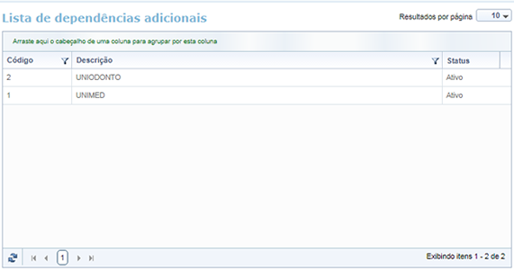 Na lista de dependências adicionais são apresentadas todas as dependências que foram cadastradas no sistema, sendo possível realizar algumas operações, como: ordenações, filtros e agrupamentos. Para saber mais clique aqui.