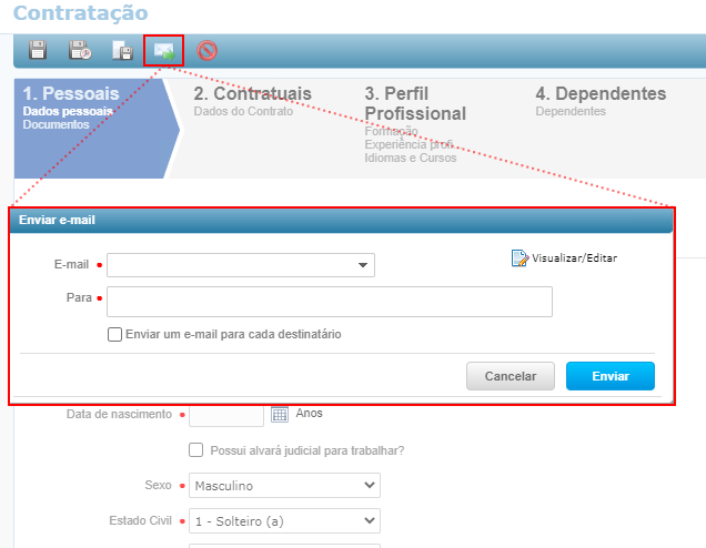 Ao realizar o processo de Recontratação, o sistema utilizará as informações pessoais do candidato presentes na base de dados, atualizando-as de acordo com o novo cadastro, assim como as informações dos dependentes, caso já estejam vinculados ao cadastro do colaborador. Se os dependentes não estiverem registrados, as informações deverão ser inseridas no momento da Contratação. É importante ressaltar que a lista de dependentes nunca poderá perder dependentes, apenas será acrescida ou atualizada.
