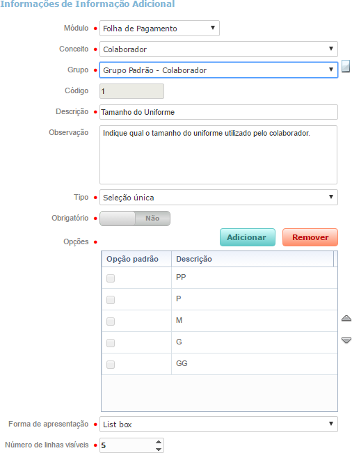 A empresa Demonstração LTDA mantém o registro de qual é a numeração dos uniformes dos colaboradores. Por padrão a Suite Gen.te não possui tal cadastro. Sendo assim, para se manter tal registro a empresa cadastrou a uma Informação Adicional chamada Tamanho dos Uniformes.
