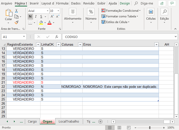 Após realizar a correção de todos os erros e a importação de nova tabela, na tela