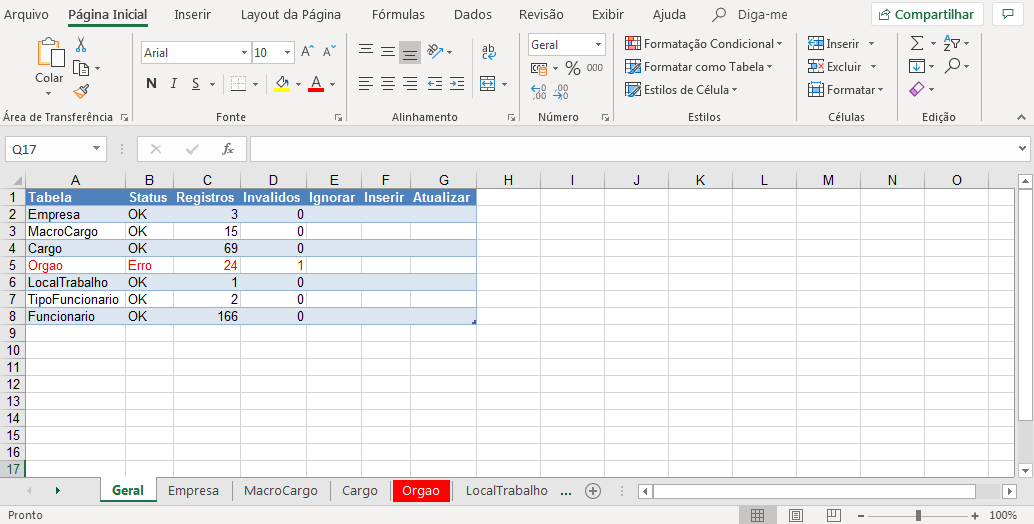 Registros Inválidos - Exibe a quantidade de registros inválidos de cada aba da planilha.