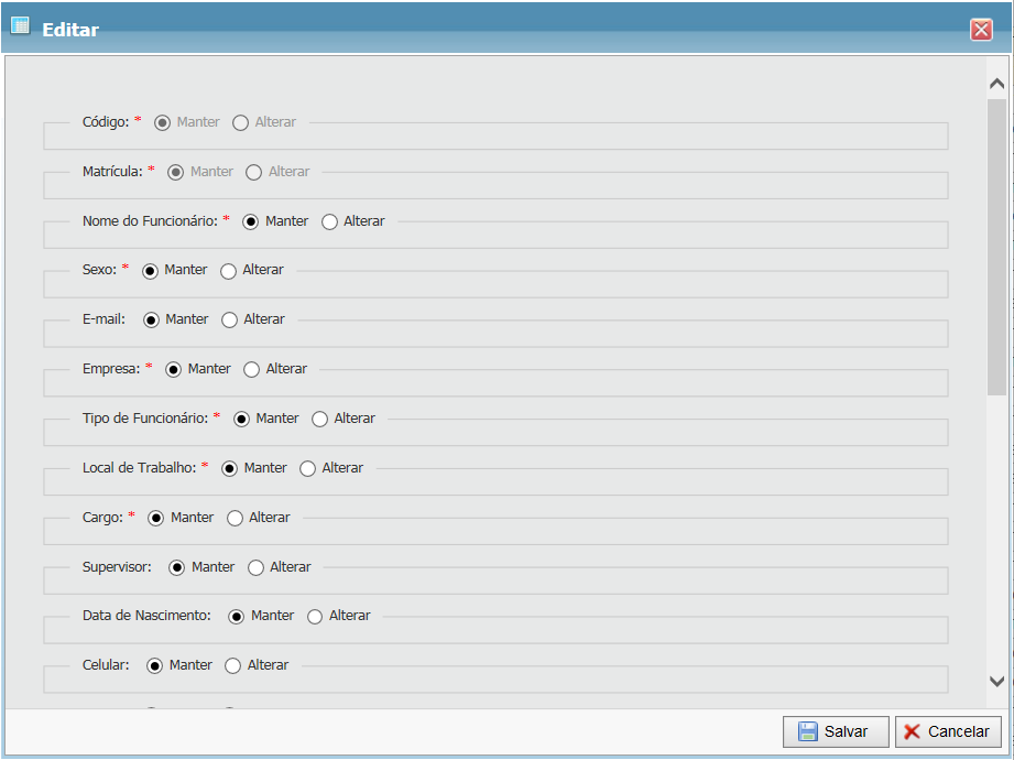 O campo Ativo sempre estará liberado para alteração de mais de um funcionário, já os demais campos serão permitidos alterar caso essa configuração tenha sido definida na implantação do projeto.