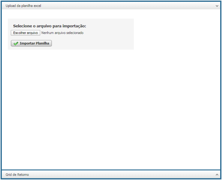 No campo Upload da planilha, selecione o arquivo a ser importado, em seguida clique em Processar.