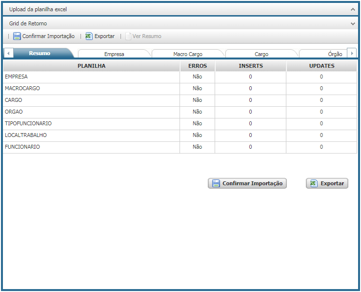 A conclusão da importação da planilha de dados corporativos só será possível quando, todos os erros apontados pelo sistema forem resolvidos e a nova tabela for importada. Antes disso, o botão Confirmar Importação ficará desabilitado.