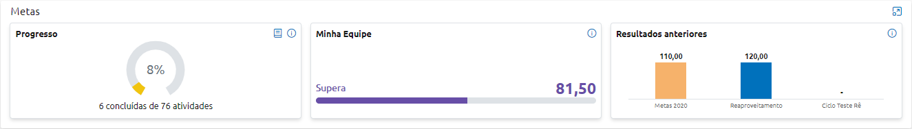 A seção Metas, é constituída por 3 opções, sendo elas, Progresso, Minha equipe e Resultado anteriores. Como nas seções anteriores, em Metas também há a possibilidade do usuário ser direcionado ao Painel de Tarefas, pelo ícone Ir ao Painel, que se localiza ao lado direito de Metas.