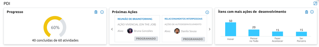A seção PDI, é formada por 3 opções, com Progresso, Próximas Ações e Itens com mais ações de desenvolvimento. Nesta seção, também é possível o usuário ser direcionado ao Painel de Tarefas, pelo ícone Ir ao Painel, que se encontra ao lado direito de PDI.