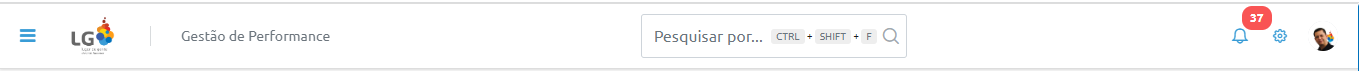 A barra de Topo é dividida em: Menu, Logotipo, Nome do Produto, Caixa de Pesquisa, ícone de Notificação, ícone de Configuração, Botão Help e Foto do Usuário.
