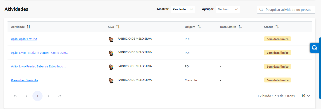 A seção Minhas Atividades exibe todas as ações do colaborador logado, sendo exibidas também as atividades a paertir do que o colaborador selecionar nos campos Mostrar e Agrupar. Como nas outras seções, essa lista é influenciada pelo campo Ciclo, ou seja, são exibidas aqui as atividades pendentes de cada ciclo que for selecionado.