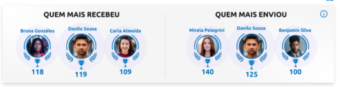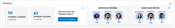 O componente Quem mais Enviou, exibirá pela visão do Colaborador o nome dos três colaboradores da Empresa que mais enviaram feedbacks no mês vigente, já na visão do gestor será exibido o nome de três colaboradores da Equipe.