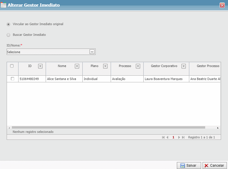 Foi selecionada a colaboradora Alice Santana, para que seja feita a alteração do seu gestor imediato.