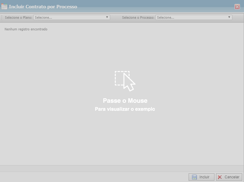 Para incluir um contrato por processo clique em , e na janela que surgir selecione o plano e o processo e inclua os