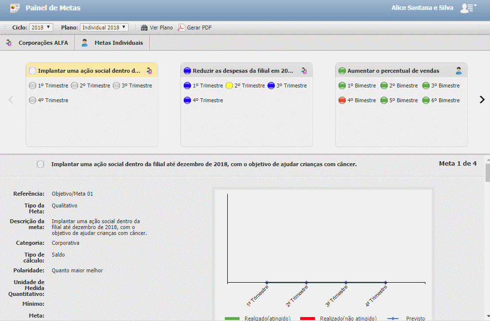 Foi selecionada a colaboradora Alice Santana para acessar o painel de metas, e exibido suas metas estabelecidas.