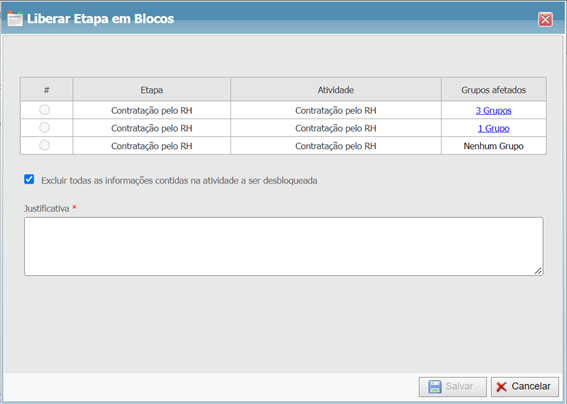 A tela de Liberar Etapa em Bloco permite que o administrador que está realizando a operação tenha conhecimento dos usuários que foram selecionados serão afetados, de acordo com cada etapa.