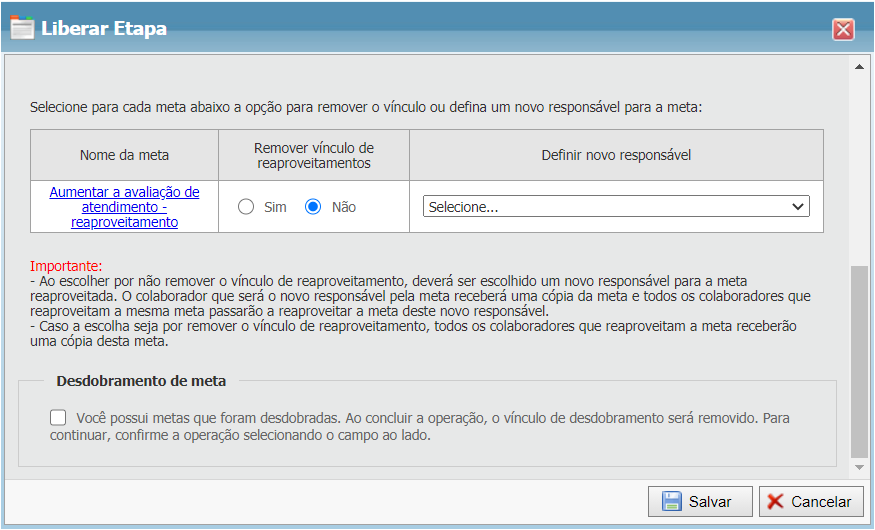 Se a opção Prosseguir for a selecionada, então todos os colaboradores que contenham metas desdobradas e/ou reaproveitadas serão ignorados e não farão parte da seleção dos colaboradores da tela de Liberação de Etapa.