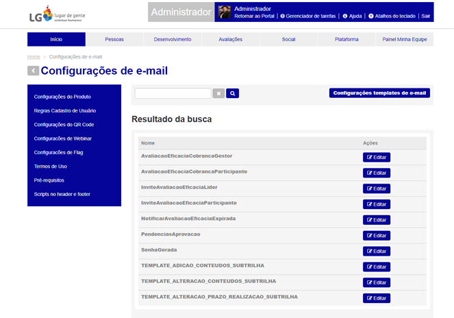 Através desta funcionalidade é possível ao administrador personalizar templates dos e-mails que são utilizados para comunicação com os usuários na plataforma.
