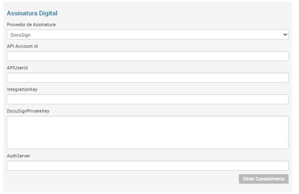 O provedo DocuSign exige que sejam preenchidos os campos API Account ID, API UserId, IntegrationKey, DocuSignPrivateKey e AuthServer que devem ser preenchidos conforme as informações do site do provedor.