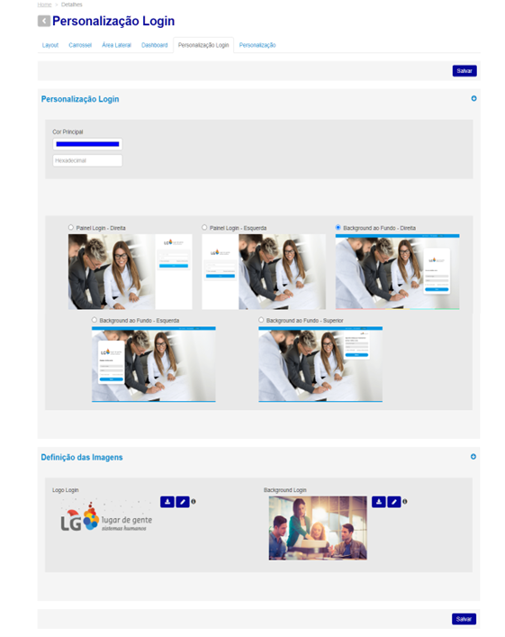 Na seção Definição das Imagens, defina o logotipo a ser utilizado na página de acesso e a imagem de fundo desejada, através dos campos Logo Login e Backgroung Login.