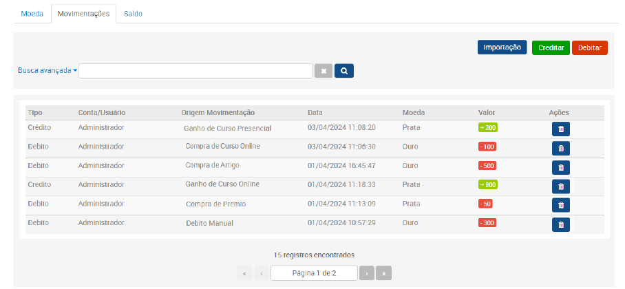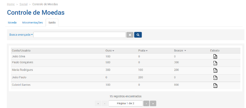 Na guia Saldo, o administrador acessa a consulta de saldo de todos os usuários da plataforma, além do extrato de movimentações das moedas.