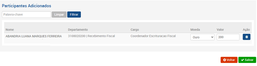 Ao selecionar um colaborador na tela acima, o sistema apresentará uma nova tela onde existirão os dados do colaborados e os campos para o tipo de moeda e se haverá o débito/crédito das moedas, ou até mesmo excluir o lançamento.