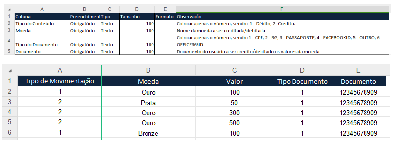 Através da tela acima, selecione a planilha para realizar a importação do um arquivo que debitará/creditará moedas aos usuários. O arquivo deve ser preenchida, conforme exemplo abaixo: